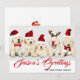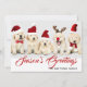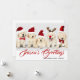 Este design de feriado apresenta uma foto de dois filhotes de Golden Retriever usando chapéus de Natal vermelhos e o texto "Saudações da Temporada" escrito em tipografia vermelha popular com um nome de família adicionado abaixo. A parte de trás do cartão tem um desenho animado de uma rena festiva. Para personalizar, você pode adicionar sua própria foto e editar o texto.