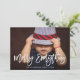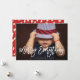 Este cartão de feriado moderno e na moda apresenta sua foto pessoal na frente, com as palavras "Feliz Tudo" em um roteiro de tendências. A parte de trás contém um padrão abstrato vermelho e branco.