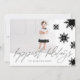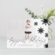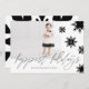 Cartão com fotos chic, moderno e na moda preto e branco de feriado com design mínimo e ousado de floco de neve. Apresenta um esquema de fotografia da família de solteiros para apresentar a sua própria fotografia de feriado especial. Flocos de neve, negros e elegantes, em cascata, a partir do topo da placa, com "Feriado mais Feliz" apresentado na caligrafia moderna. O verso apresenta um design de fundo com floco de neve abstrato em preto e branco. Todas as ilustrações são obras de arte originais desenhadas à mão por Moodthology Papery.
