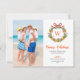 Elegante cartão de cumprimentos fotográficos de Feliz Férias com laranjas em aquarela e coroa de folhagens cítricas com laço vermelho.