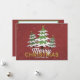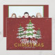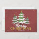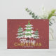 Envie este cartão alegre a toda a sua família e amigos. Inclua uma foto da família no verso para manter contato com seus entes queridos durante o feriado. Esta design apresenta três árvores de Natal nevadas com fundo vermelho e flocos de neve. O texto abaixo diz "Feliz Natal e Feliz ano novo".