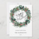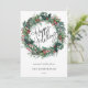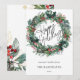 A caligrafia de Feliz Feriado está marcada em um cartão de Feriado de Natal, cor d'água, bonitinha e colorida. A coroa apresenta aquarela e folhagem de rabanete, bagas coloridas e acentos de ouro.