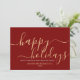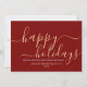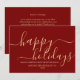 Cartão vermelho de negócios simples e minimalista, com um roteiro elegante e moderno que lê "Feliz feriado" em uma bela cor dourada. Este cartão é totalmente personalizável. Você pode mudar qualquer mensagem com a de sua escolha. Espalhe alegria e calor nesta temporada de festas para colegas e clientes com nosso cartão maravilhosamente projetado. Feliz Feriados!