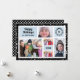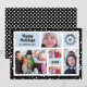 Pontos brancos como neve caindo no preto com sotaques azul claro e cinco de suas fotos favoritas da família em um cartão de foto contemporâneo divertido para as festas de fim de ano com texto totalmente personalizável.