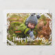 Cartão de foto de férias com "Férias Felizes" escrito em uma fonte cursiva extravagante, dentro de uma moldura de agulhas de pinheiro brancas.
