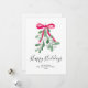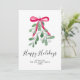 Este cartão de férias é decorado com viscossa verde em aquarela, uma fita vermelha e tipografia de roteiro elegante que diz "Féérias Felizes"
