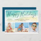 Envie saudações da estação quente com este cartão de Natal temático de praia. Os cartões de Natal fotográficos costeiros apresentam uma onda de aquarela verde-mar sobre uma costa arenosa. Letras cursivas no topo da onda dizem "Feliz Natal" em uma cor azul-esverdeada de oceano bonita. Três fotos são colocadas abaixo da onda pintada. Para personalizar, adicione seus nomes e três fotos favoritas.