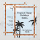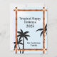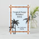 Um cartão de Natal tropical com céu azul e silhuetas de palmeiras. Tudo por trás de uma moldura de quatro postes de bambu para um toque quente e exótico. O texto sugerido "Tropical Happy Holiday 2025" pode ser personalizado com a sua palavra preferida, juntamente com o nome da sua família.