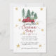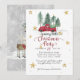 "Cartão de Natal da Festa Alegre Natalzinho Caminhão Vermelho Fazenda dos Gnomos." Ilustração em aquarela de um caminhão vermelho antigo na fazenda de árvores de Natal dos gnomos com estrelas douradas e flocos de neve convidam você para uma Festa Alegre Natalzinho! Um par de renas e outro gnomo estão no verso junto com um fundo cinza suave com padrão de flocos de neve caindo. Arte de Audrey Jeanne Roberts, direitos autorais.