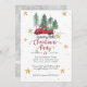 "Cartão de Natal da Festa Alegre Natalzinho dos Gnomes na Fazenda Caminhão Vermelho." Ilustração em aquarela de um vintage caminhão vermelho da fazenda na floresta de árvores de natal dos gnominho com estrelas douradas e flocos de neve convidam você para uma Festa Alegre Natalzinho! Um par de renas e outro gnomo estão no verso junto com o fundo cinza suave com padrão de flocos de neve caindo. Arte por Audrey Jeanne Roberts, direitos autorais.