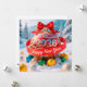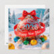 Enfeite de festa de Ano Novo 2026 em um cenário de inverno nevado, apresentando uma bolha vermelha brilhante com redemoinhos dourados e prateados, adornada com um laço vermelho grande e cercada por enfeites coloridos de Natal. Cena perfeita de saudação festiva de férias.
