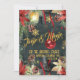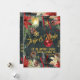 Um convite de festa de Natal festivo, luxuoso e elegante, apresentando um fundo escuro de floresta de inverno com flocos de neve dourados cintilantes, poinsettias pintadas à aguarela, pinhas, frutos vermelhos com uma lanterna quente iluminada e um enfeite de bola vermelha brilhante em fita vermelha caindo no ar. A frente do convite diz: Jingle & Mingle, Na Casa dos Austin, Sábado, 8 de dezembro, 20h, enquanto o verso tem o seu endereço e os detalhes necessários para RSVP.