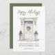 Rótulo moderno "Festas Felizes" imagem da porta da frente com aquarela decorada com verde natalino.