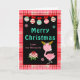 This cute and fun holiday card can be personalized with a family name or title. It features an adorable flamingo in reindeer antlers on a pink and red plaid background. The text combines sans serif fonts for a stylish and modern look. Winter snowflakes and patterned baubles add a festive touch.