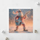 Uma fotografia divertida, caprichosa e altamente detalhada ou renderização 3D apresentando uma figura estilizada e fofa do Papai Noel vestido com seu traje tradicional vermelho e branco. O Papai Noel está usando óculos de sol escuros e faz uma pose dramática de rock-and-roll enquanto toca entusiasticamente um violão elétrico azul claro e branco. A cena é ambientada ao ar livre em uma forte nevasca, com grandes flocos de neve macios caindo ao seu redor. O fundo é desfocado com uma luz quente e alaranjada emanando do horizonte.