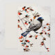 O inverno foi introduzido em uma floresta. Um pássaro pousa em um galho, inspecionando curiosamente seu entorno invernal.
