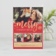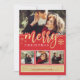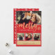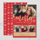 Cartão de Natal elegante e moderno com texto de caligrafia caprichosa que diz FELIZ NATAL acentuado com flocos de neve dourados falsos em um fundo vermelho festivo. O cartão vem com um design de padrão de floco de neve correspondente no verso.