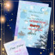 Celebre a magia do inverno com este cartão de Natal e Ano Novo de flocos de neve azuis com silhuetas de rena e elementos festivos cintilantes. Um cartão sazonal perfeito para desejos alegres de inverno para download instantâneo.