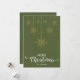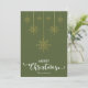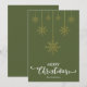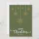 Oliva escuro verde Feliz Natal com elegante grafia decorativa e design de flocos de neve dourados pendurados. Este cartão de Natal com cor de fundo verde é projetado para que você possa alterar a cor do fundo. Você também pode inserir o nome da sua família ou removê-lo se desejar ter apenas o design sem o texto. Você também pode personalizar a cor das palavras "Feliz Natal" editando este design se desejar.