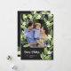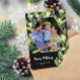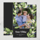 Cartão de foto de férias floral com sua foto dentro de uma forma hexagonal rodeada por folhagens verde-sage, mirtilos azuis e flores brancas com Boas Festas abaixo em um script.