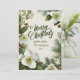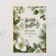 Traga elegância eterno aos seus cartões de natal com este design de Natal verde e branco. Apresentando flores de inverno, galhos de pinheiros verdes e sotaques naturais suaves, ele captura perfeitamente o charme pacífico da estação. A combinação de flores delicadas e verde rústico faz dela uma escolha refinada, mas acolhedora, para espalhar alegria festiva.