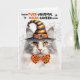 Este Gato Florestal Norueguês tem a variação de cor chamada Sarda Prateada e parece tão doce em acessórios de Dia das Bruxas, cor de laranja e preto, que emparelha com uma mensagem felina humorística.