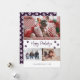 Cartões de fotos roxas personalizados, felizes, com três fotos, com um título manuscrito na frente e roxo, com neve caindo e pegadas na parte de trás. Personalize facilmente estes Cartões de foto de Natal roxos com as suas imagens, um nome de família e o ano. Este cartão de Natal bonito pode ser transformado em qualquer cor usando a ferramenta de personalização.
