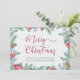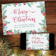 Cartão de Natal simples e elegante, personalizado com sua mensagem e nome(s). Este design de aquarela tem uma bela borda de folhagem e verde de inverno, com pinhos cones, flores, sagras e bagas na frente e uma floresta de abetos nas costas. Feliz Natal é manchado em caligrafia suave e seu texto personalizado é impresso em tipografia moderna. Por favor, navegue na minha loja para coordenar itens, presentes e decoração doméstica.