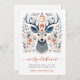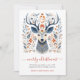 Cartões de Natal, estilo Scandi nórdico, russos, com uma rena decorada cercada por folhagem em tons de azul e ferrugem. Feliz Natal em tipografia de guião. Adicione seu próprio verso e nomes. Disponível no impressão, como download digital ou ambos!