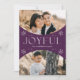 Deseje aos entes queridos uma feliz temporada de festas enviando-lhes um cartão de festas de tendências projetado por Late Bloom Paperie! O cartão de feriado exclusivo apresenta duas fotos dentro de um quadro fotográfico em arco roxo. "Joyful" é exibido em letras brancas modernas, acentuadas por flocos de neve desenhados à mão. Personalize a frente do Cartões de foto de Natal adicionando seu nome. A parte traseira do cartão de feriado multifoto exibe um padrão roxo de floco de neve.