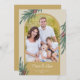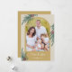 Um cartão de Natal elegante com uma foto arqueada trendy. O design é acentuado com folhagem de inverno e frutas vermelhas em um fundo dourado.