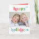 Um cartão de saudação de férias com foto caprichosa com uma mensagem colorida de boas festas na frente para um clima divertido, alegre e festivo. O interior tem outra área para uma grande foto do cliente e uma cor de fundo coordenada com espaço para uma mensagem personalizada.