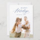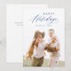 O design moderno minimalista do cartão de felizes festas apresenta um script elegante e moderno na cor azul, com foto da família personalizada, simples e único.
