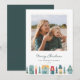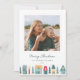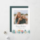 Um design de cartão de férias doce e festivo, com uma fotografia quadrada solteiro com uma ilustração da borda inferior das casas desenhadas à mão e das árvores em cores de férias. "Feliz Natal" ou sua escolha de cumprimentos aparece abaixo de sua foto, junto com seu nome de família e o ano.