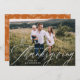 Cartão com fotos moderno de Ação de Graças que apresenta a sua foto horizontal favorita de sangramento de cheio com "Ação de Graças Feliz" em uma cobertura branca de script de caligrafia. Personalize a frente do simples cartão de Ação de Graças adicionando seus nomes ou texto personalizado. A parte traseira da placa apresenta um padrão de folhagem branco com um fundo laranja queimado ou cor da sua escolha.