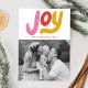 Cartão de férias preto e moderno com "Joy" em letras cor-de-rosa, vermelha e dourada com a sua foto favorita da família, mostrada abaixo. Personalize a frente do cartão de feriado colorido adicionando seu nome e o ano. O cartão de feriado com letra manual se inverte para apresentar um padrão de pontos brancos contra um fundo vermelho. Projetado para coordenar com nossa coleção de cartões de Natal Colorida Modern Joy.