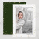 Cartões de foto estilosos e fofos são perfeitos para todos os seus amigos e familiares nesta época de festas. Personalize o texto "saudações da temporada" com a sua própria saudação e altere o nome da família e o ano e troque a imagem por uma foto de seus filhos, animal de estimação ou de toda a família. O design apresenta uma borda preta em torno da imagem com boque de ouro ao fundo e um espaço para colocar o nome da sua família e o ano. O verso apresenta o mesmo boque de ouro com estrelas douradas em um fundo verde.