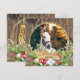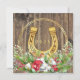 Cartões de Natal personalizados com a foto do cavalo em madeira, elementos de ouro, coroa de Natal e um sapato de ouro no verso com o texto nos dois lados.