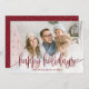 Envie cartões com fotos de férias simples e na moda para sua família e amigos este ano com esses cartões modernos estilizados de Impressões Orabella. A sobreposição de texto elegante diz, "Feriados Felizes" em vermelho de bagas sobre uma camada branca de gradiente na parte inferior da placa. A parte de trás apresenta pequenos pontos brancos de neve sobre um fundo vermelho, que pode ser personalizado para qualquer cor que você quiser.