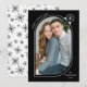 Envie alegria natalina para familiares e amigos com um cartão de Natal exclusivo da Late Bloom Paperie! O cartão de Natal moderno exibe sua foto dentro de uma moldura de foto curva preta e branca decorada com um floco de neve branco. Personalize a frente do cartão de Natal com foto adicionando uma saudação com um estilo de texto curvo, nome e ano. O verso do cartão exibe um padrão de floco de neve preto.