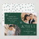 Deseje aos entes queridos uma feliz temporada de festas enviando-lhes um cartão de festas de tendências projetado por Late Bloom Paperie! O cartão de feriado exclusivo apresenta duas dentro de fotos de um quadro verde horizontal de fotos. "Joyful" é exibido em letras brancas modernas, acentuadas por flocos de neve desenhados à mão. Personalize a frente do Cartões de foto de Natal adicionando uma mensagem, um nome e um ano personalizados. A parte de trás do cartão de feriado multifoto mostra um padrão verde de floco de neve.