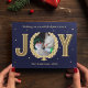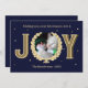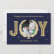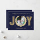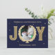 Cartão de Natal personalizado com a foto do seu gato, a palavra alegria, e um design azul marinho e dourado. Personalize este cartão com tema de estimação com uma mensagem de Festa Festiva. Para adicionar texto extra no verso, clique no botão para editar a design.