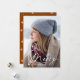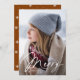 Cartão com fotos moderno de feriado com "Feliz" exibido em um script branco manuscrito sobre sua foto vertical. Personalize a frente do Cartões de foto de Natal com seu nome de família e o ano. A carta se reverte para um pão de gengibre e padrão branco de flocos de neve.