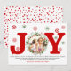 Cartão de Natal. Mostra a palavra "ALEGRIA" com flocos de neve vermelhos e verdes, enquanto em vez da letra "A" há sua foto em uma moldura de grinalda de Natal floral. O verso inclui confetes de bolinhas vermelhas.