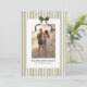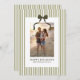 Este cartão de Natal apresenta uma foto e listras verdes clássicas e um laço para enviar saudações de Natal para amigos e familiares.