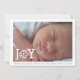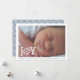 Cartão de foto chapado de Natal moderno e minimalista de "alegria" e floco de neve. Ele apresenta uma foto de bebê e a palavra "ALEGRIA" em branco com um floco de neve em vez da letra O e uma borda branca ao redor. No verso, há um padrão de flocos de neve brancos em um fundo azul empoeirado.