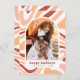 Este cartão com fotos de Natal apresenta uma fotografia em forma de arco e um padrão de entalhe para uma aparência divertida e única de férias. A frente lê "feriados felizes" em uma fonte retrô em negrito. O esquema de cores é uma paleta quente de vermelho, rosa, amarelo e creme. Cartões inverter para uma segunda foto quadrada com espaço para sua mensagem personalizada. Veja a coleção ligada nesta página para coordenar itens ou visite a nossa loja para mais cartões com fotos de Natal.