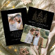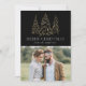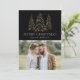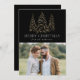 Cartão de feriado moderno e elegante com sua foto complementado por três pinheiros de folha de ouro falso-neve com fundo preto (ou cor de sua escolha). "Feliz Natal" é apresentado numa fonte serif branca e moderna com o seu nome ou texto personalizado abaixo. O cartão de feriado fotográfico é revertido para exibir uma foto adicional com sua mensagem personalizada abaixo em texto branco.