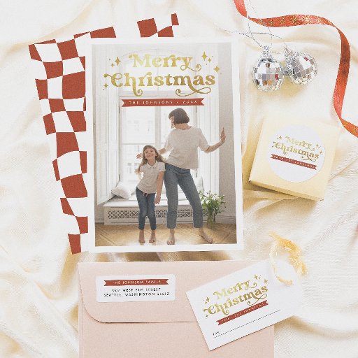 Um design Cartões de foto de Natal ousado e retrô. A frente mostra uma foto personalizada de sua escolha dentro, uma elegante borda branca. No topo, o "Feliz Natal" é impresso em ouro falso em tipografia hippie retrorada, com flores e espirais cômicas. A tipografia é decorada com estrelas desenhadas à mão e faíscas. Abaixo do texto da camada, há uma faixa vermelha festiva com seu nome de família em letras maiúsculas. A parte traseira da placa apresenta um padrão de verificação desfocado e você tem a flexibilidade de personalizar a faixa e a cor do padrão para se adequar às suas preferências. Uma design divertida e groovy com um toque de nostalgia e uma vibração moderna. Este design ousado e colorido tem uma sensação divertida, fazer a escolha de um excelente para compartilhar alegria de feriado com uma reviravolta única. Personalize com seu nome e sua foto favorita do ano passado. Sinta-se à vontade para me enviar qualquer pergunta, apenas por favor note que não posso modificar uma ordem existente. Veja a coleção vinculada nesta página para coordenar produtos de papel. Procure mais Cartões de foto de Natal na nossa loja.
