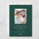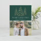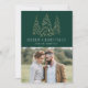 Cartão de feriado moderno e elegante com sua foto complementado por três pinheiros de folha de ouro falso-neve com fundo verde (ou cor de sua escolha). "Feliz Natal" é apresentado numa fonte serif branca e moderna com o seu nome ou texto personalizado abaixo. O cartão de feriado fotográfico é revertido para exibir uma foto adicional com sua mensagem personalizada abaixo em texto branco.